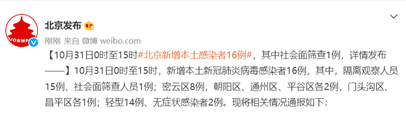 10月31日0时至15时北京新增本土感染者16例详情通报