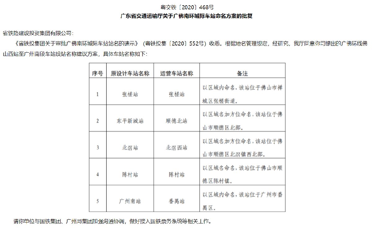 此外,据去年8月《广东省交通运输厅关于广佛南环城际车站命名方案的批复》,沿线将设置张槎站、顺德北站、北滘西站、陈村站等站点。