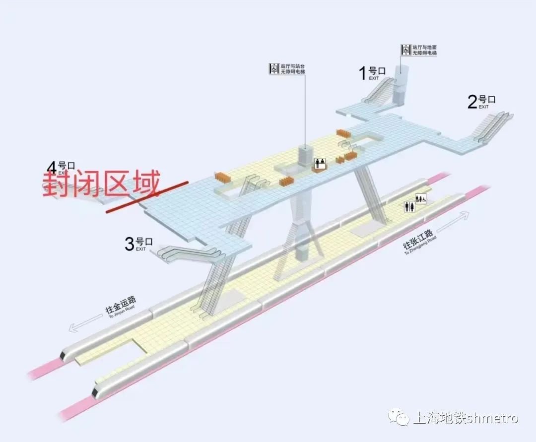 车站地面层张贴友情提示,请乘客从其他出入口进出站。