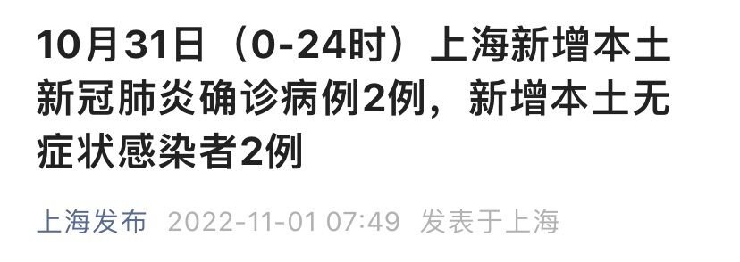 上海市卫健委11月1日通报:2022年10月31日0—24时,新增本土确诊病例2例和无症状感染者2例,其中1例确诊病例和2例无症状感染者在隔离管控中发现,1例确诊病例在常态化核酸检测中发现,详情如下。