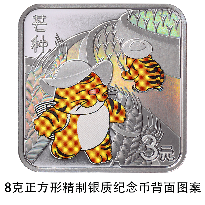 8克正方形银质纪念币背面图案以虎、小麦、稻苗为主要设计元素,展现芒种时节抢收抢种农忙景象,并刊“芒种”字样及面额。