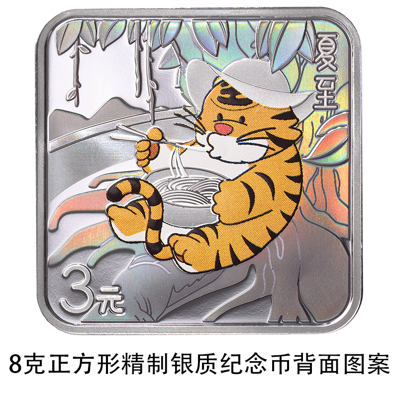 8克正方形银质纪念币背面图案以虎、榕树、面条为主要设计元素,展现夏至时节“夏至吃面”习俗,并刊“夏至”字样及面额。
