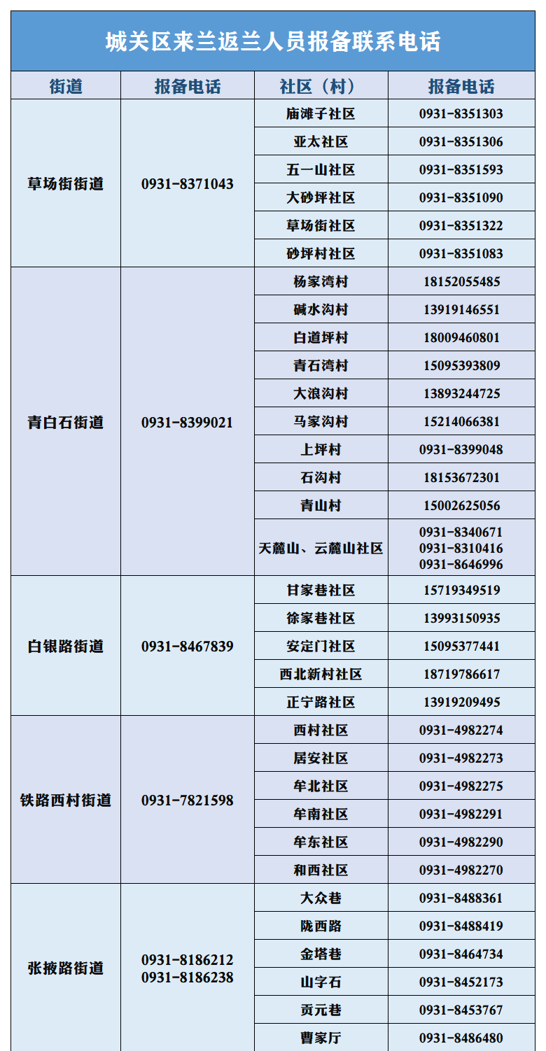 近期,国内多地发生新冠肺炎疫情,疫情防控形势依然严峻复杂。为切实做好现阶段疫情防控工作,畅通报备渠道,降低疫情传播风险,现就做好城关区来兰返兰人员报备联系电话公布如下: