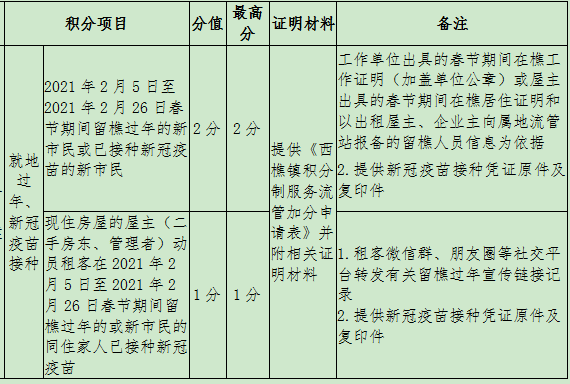4月1日,西樵镇发布《关于2021年西樵镇新市民积分制自定加分项目补充调整的说明》,对“就地过年”积分项目加分项予以补充调整,补充新市民或同住家人接种新冠疫苗可获积分加分内容。