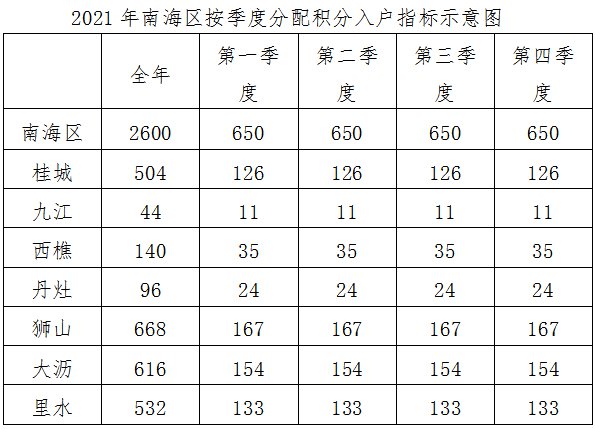 一、南海区2021年积分入户指标数共2600个,现根据2020年各镇(街道)的积分入户申请总数按比例按季度分配: