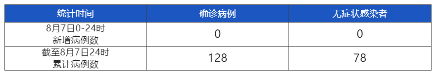 8月7日0-24时,成都“07·20”疫情无新增本土确诊病例,无新增本土无症状感染者。截至8月7日24时,本起疫情累计报告本土确诊病例128例,本土无症状感染者78例。