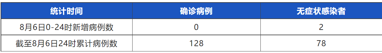 8月6日0-24时,“07·20”疫情无新增本土确诊病例,新增本土无症状感染者2例。截至8月6日24时,本起疫情累计报告本土确诊病例128例,本土无症状感染者78例。