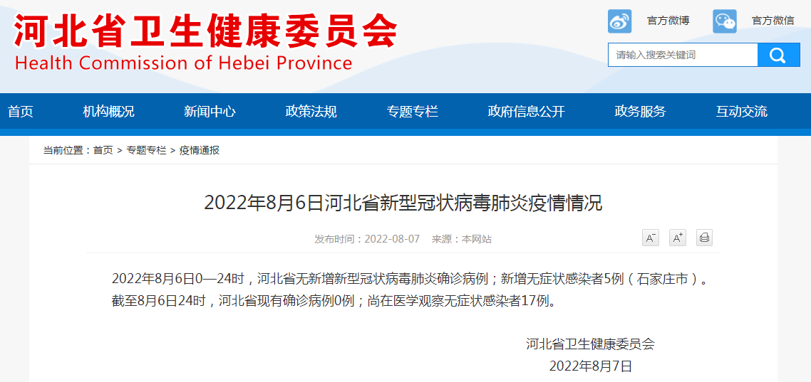 2022年8月6日0—24时,河北省无新增新型冠状病毒肺炎确诊病例;新增无症状感染者5例(石家庄市)。