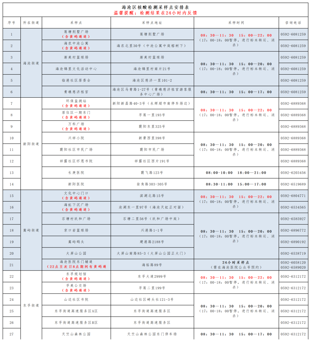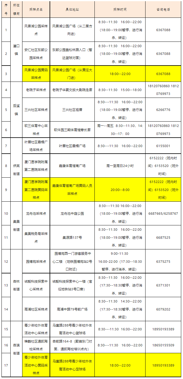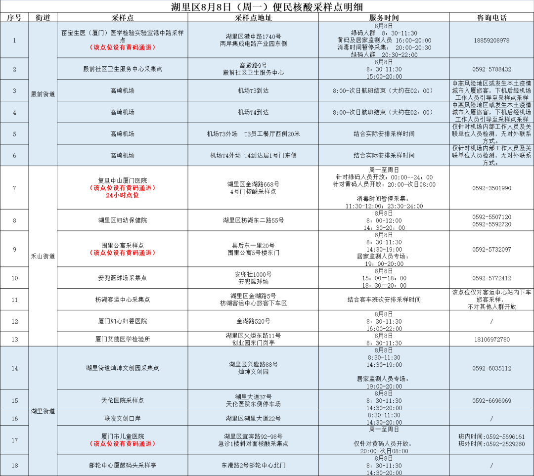8月8日,海沧区安排27个便民核酸检测采样点,4个街道均设有黄码人员专用检测通道。海沧医院设有24小时核酸检测采样点。