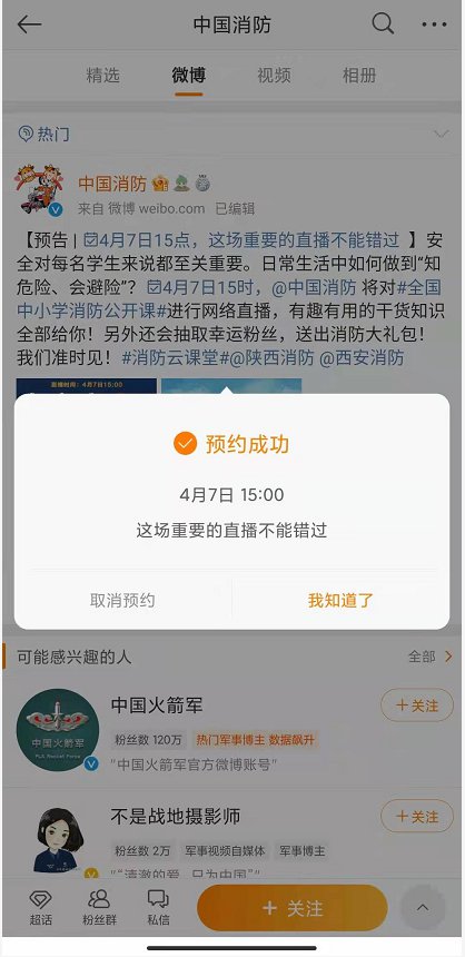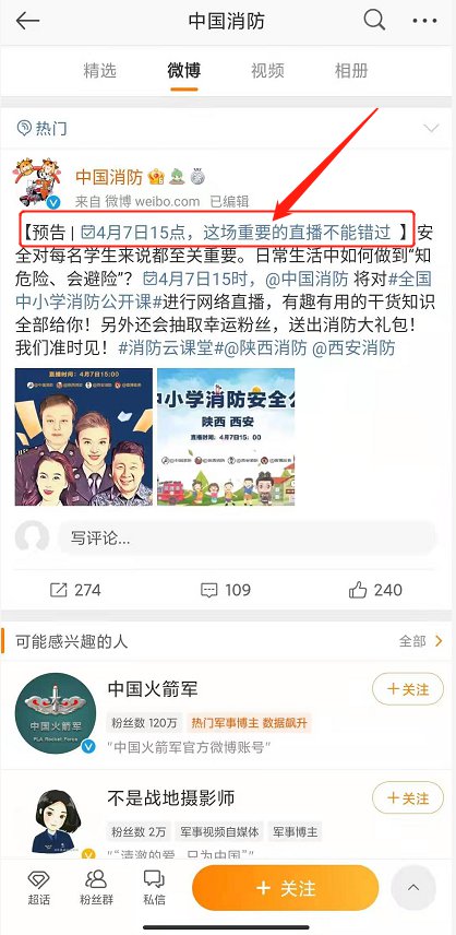 本次公开课将在消防救援局官方微博 @中国消防 进行直播,大家可以通过@中国消防 官方微博进行预约收看。
