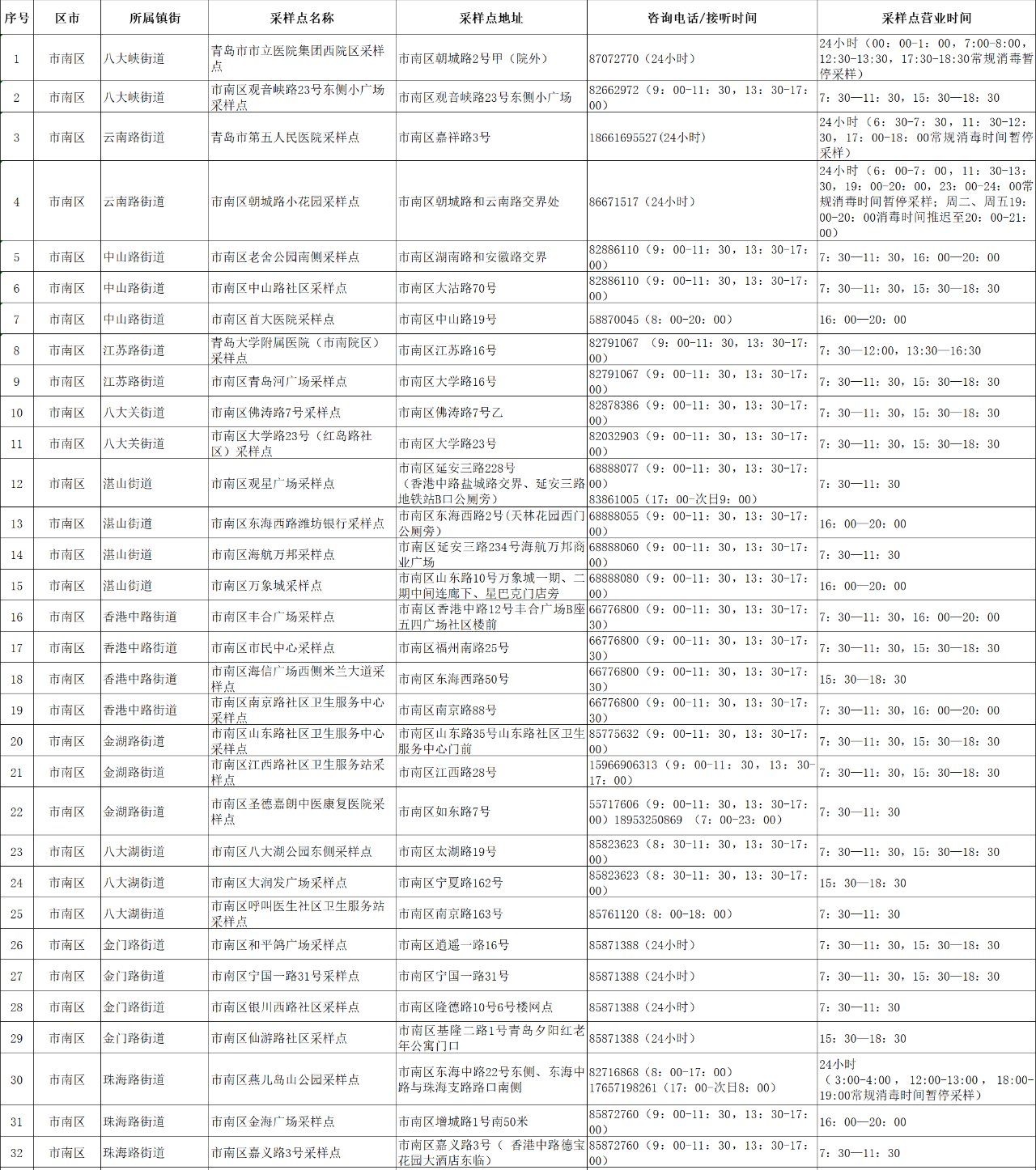 青岛市南区核酸检测“愿检尽检”采样点一览表