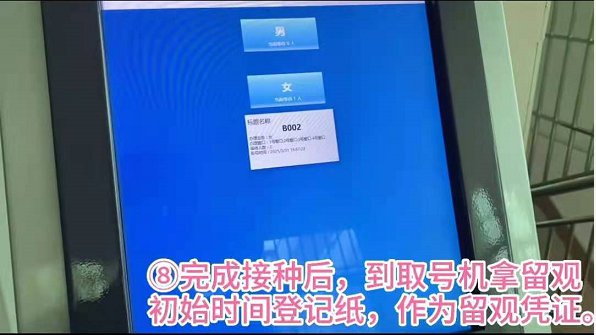 ⑧完成接种后,到取号机拿留观初始时间登记纸,作为留观凭证。