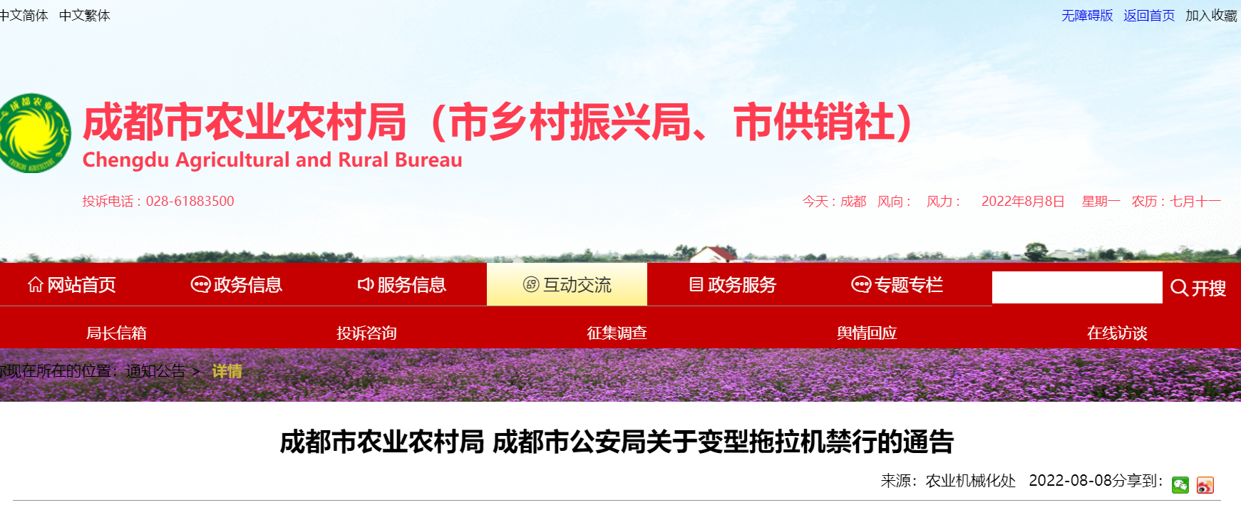 为进一步规范道路交通和农机安全监管秩序,彻底消除变型拖拉机道路交通安全风险隐患,保障社会公共安全,减少尾气排放污染,改善大气环境,根据《中华人民共和国道路交通安全法》《中华人民共和国道路交通安全法实施条例》《农业农村部办公厅公安部办公厅关于进一步加强拖拉机安全管理工作的通知》(农办机〔2021〕1号)《四川省农业农村厅四川省公安厅关于切实做好拖拉机安全管理工作的通知》(川农发〔2021〕121号)和《成都市大气污染防治工作行动方案》等规定,现决定在全市实施变型拖拉机禁行的交通管理措施。现将有关事项通告如下: