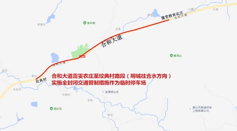 合和大道霭雯教育农庄至坟典村路段(明城往合水方向)实施全封闭交通管制措施作为临时停车场。