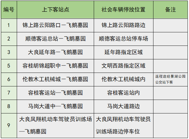 4、大门三叉口至七八一七路口路段、大门东路顺德大道及南翔路隧道入口处,高峰时段禁止社会车辆进入,仅允许免费公交车辆驶入。飞鹅墓园区环山路(4月1日至15日)禁止社会车辆通行。