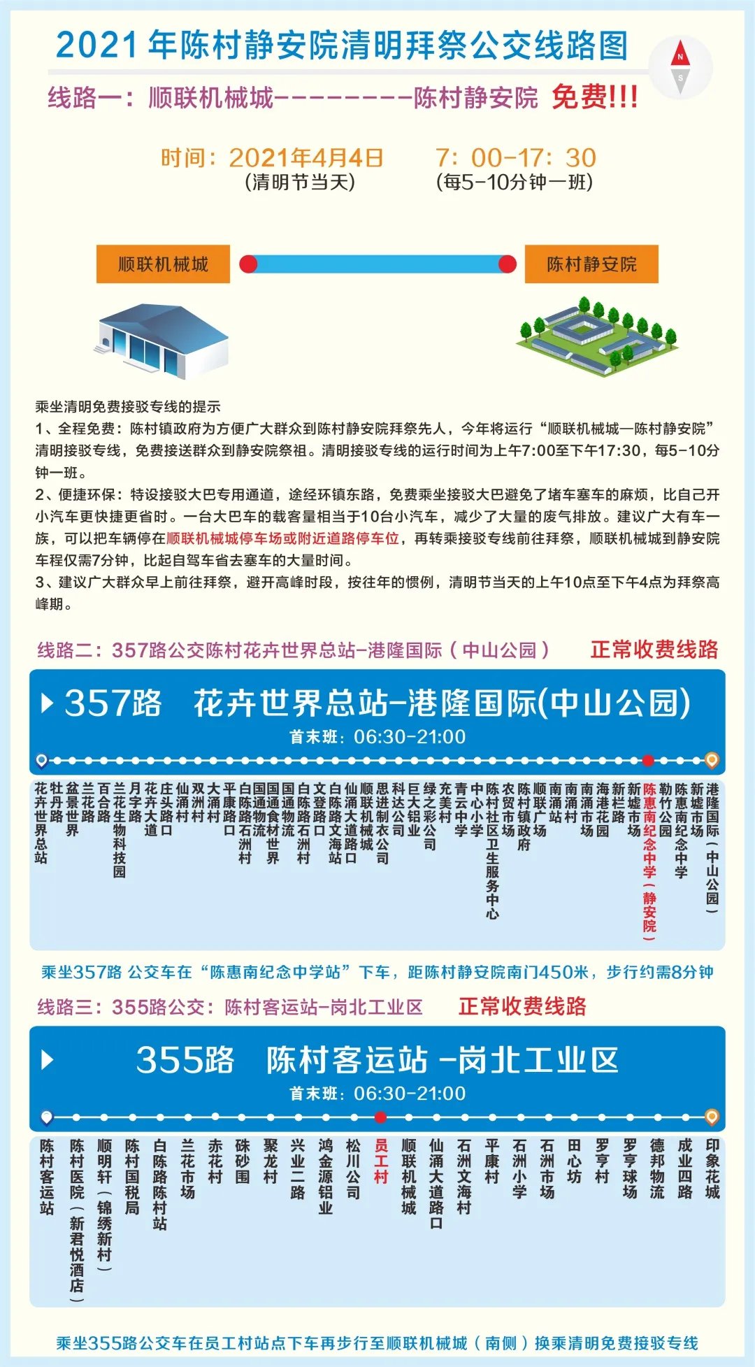 2021年4月4日当日,陈村镇将投入12台大巴车运行“顺联机械城-陈村静安院”清明拜祭免费接驳专线,全程行驶环镇东路,全程直达免费,欢迎广大群众乘坐。