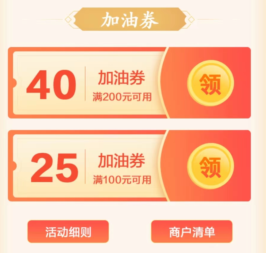 活动内容:活动期间,登录云闪付APP,在“陕西消费券’专区——“未央区消费券”栏目位置领取面值40元、25元的加油券,票券有效期内在符合条件的商户进行云闪付APP扫码支付满相应金额即可抵扣。领取的优惠券不可叠加使用,单次支付仅可核销一张优惠券,有效期内未核销,消费券自动收回且不予补发。单用户同一票券每个自然周内(周一至周日)限领一张,消费券数量有限,先到先得,领完为止。
