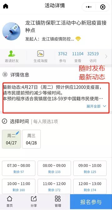 之前使用各村居二维码(旧预约系统)登记的市民,我们也会分批发送短信通知接种,收到短信通知的市民,请携带身份证到防保职工活动中心(龙悦江山南侧,从龙江交通中心南路进入)新冠疫苗大型接种点接种。同时也欢迎使用新系统进行预约,可预约具体时间。