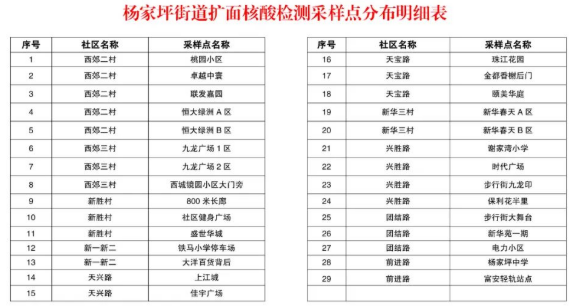 各社区29个核酸检测点(具体明细附后)。