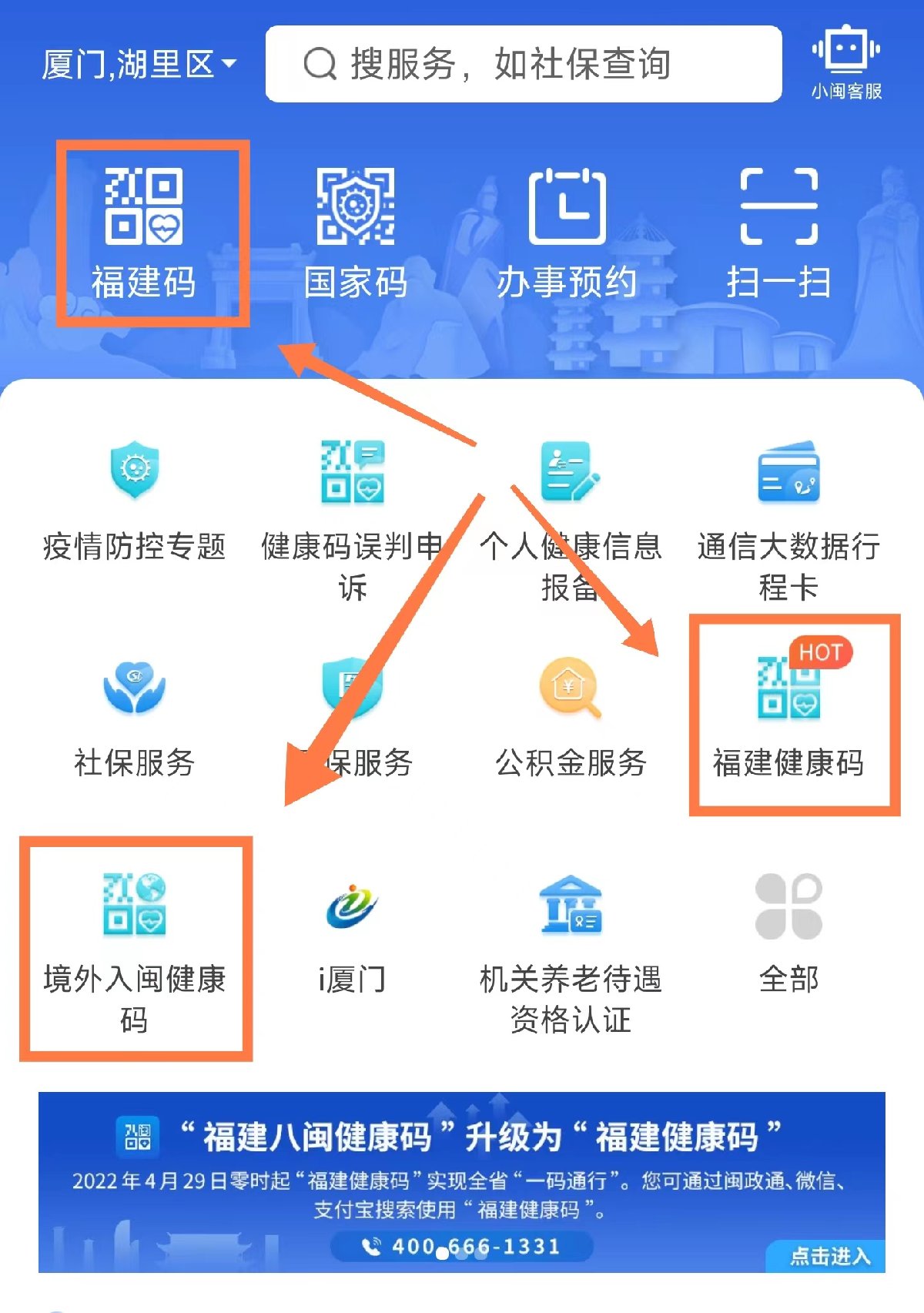 闽政通App申领步骤:用户下载安卓版或IOS版闽政通APP,完成注册及人像实名认证。登录闽政通首页后,打开“扫一扫”图标扫描上方二维码或点击“福建健康码”图标,进入亮码页面完成申领。