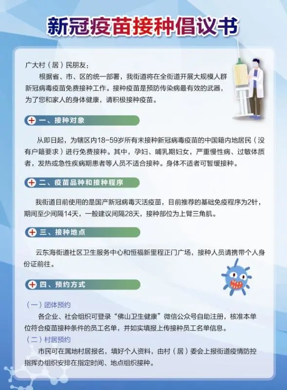 凡是18至59周岁内佛山市常住居民(包括本地居民、在佛工作人员、暂住人员、企业人员)都可以在云东海街道辖区内的疫苗接种点进行免费接种新冠疫苗。