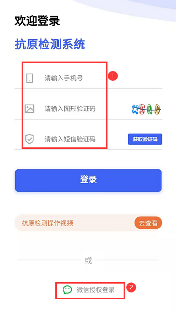 (3)打开自测人登录窗口,支持两种登录方式:①通过手机+短信验证码登录系统;②通过微信授权登录
