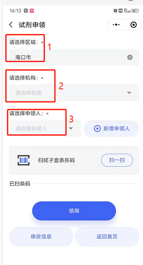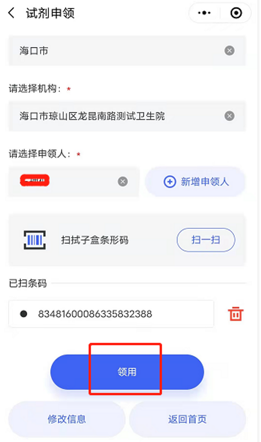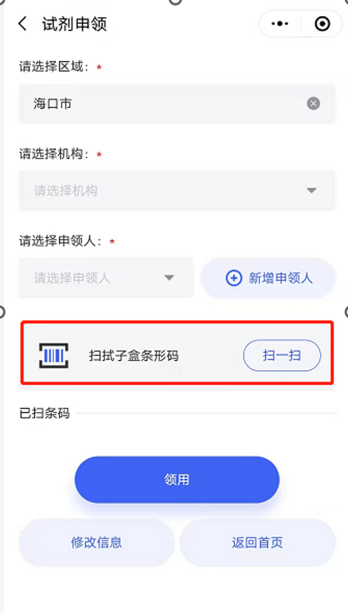 (3)扫条形码:一个申领人可以领多个试剂盒条形码。