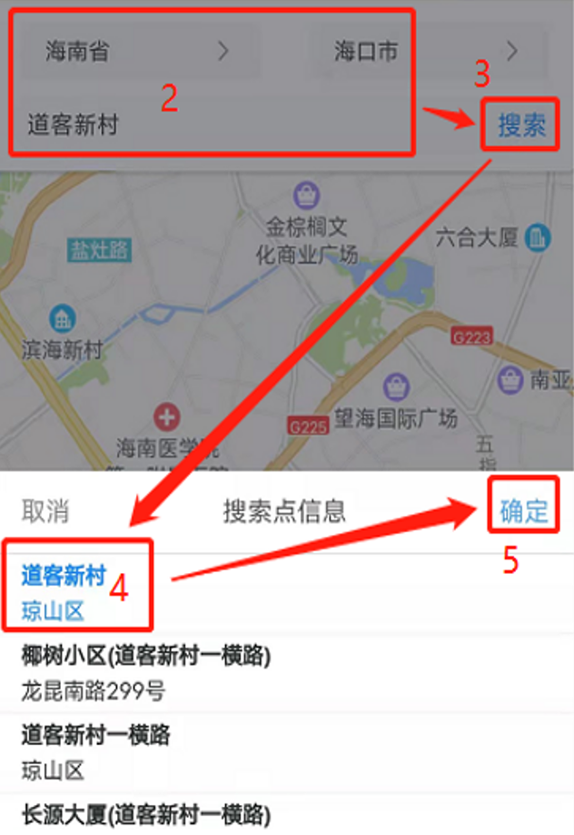 (5)点击检测地点下拉框-选择搜索条件-点击【搜索】-在搜索结果列表中选择地点-点击【确定】
