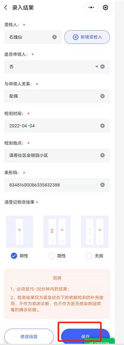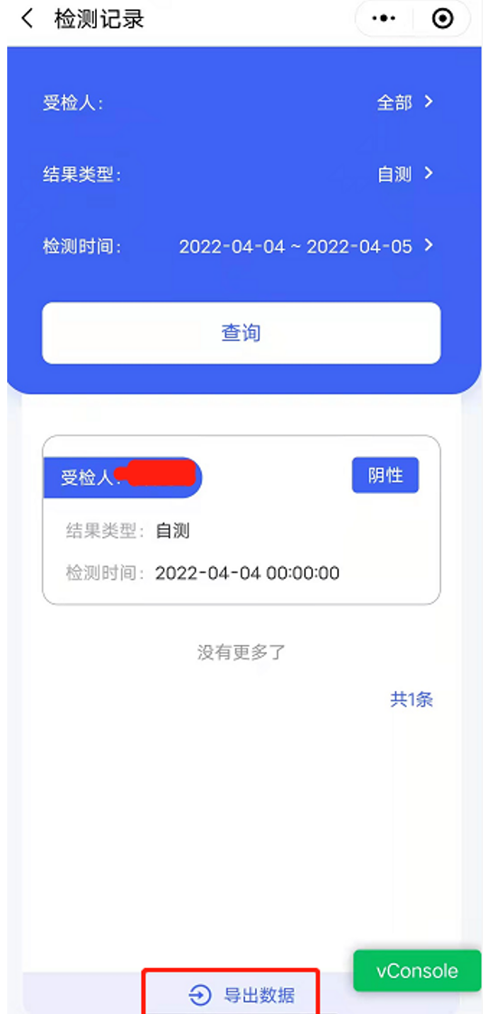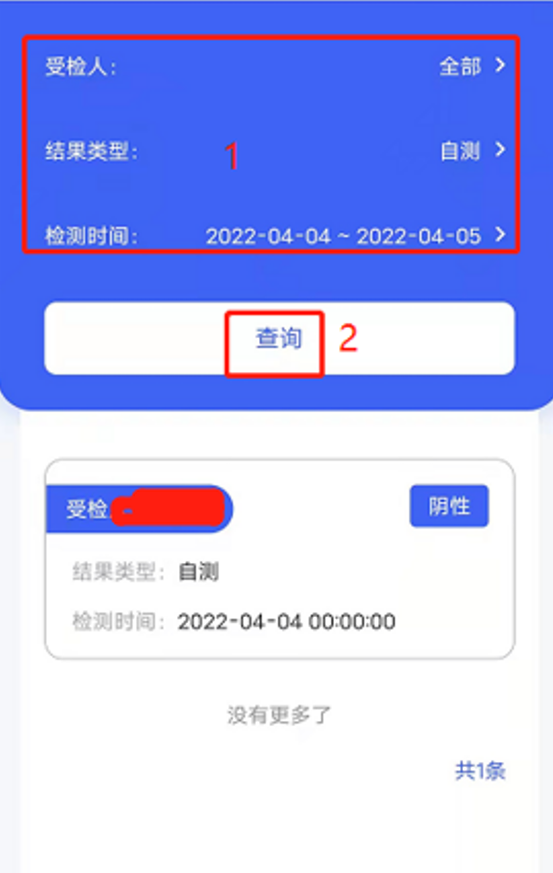 (1)检测时间:如果结果类型是自测,则是自测人在【录入结果】页面登记的检测时间。如果结果类型是医院检测,则是工作人员点击“开始检测”的时间。