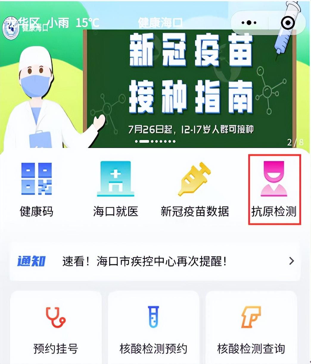 (1)微信打开小程序【健康海口】,找到抗原检测图标,点击打开。
