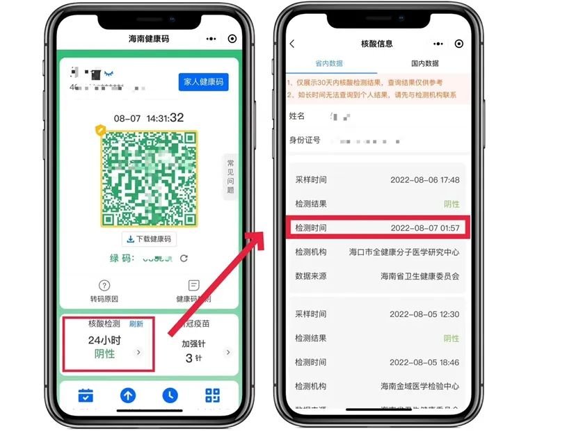 用户可在海南健康码-【核酸检测】模块处点击查看具体的核酸采样、检测时间、检测结果、检测机构及数据来源。