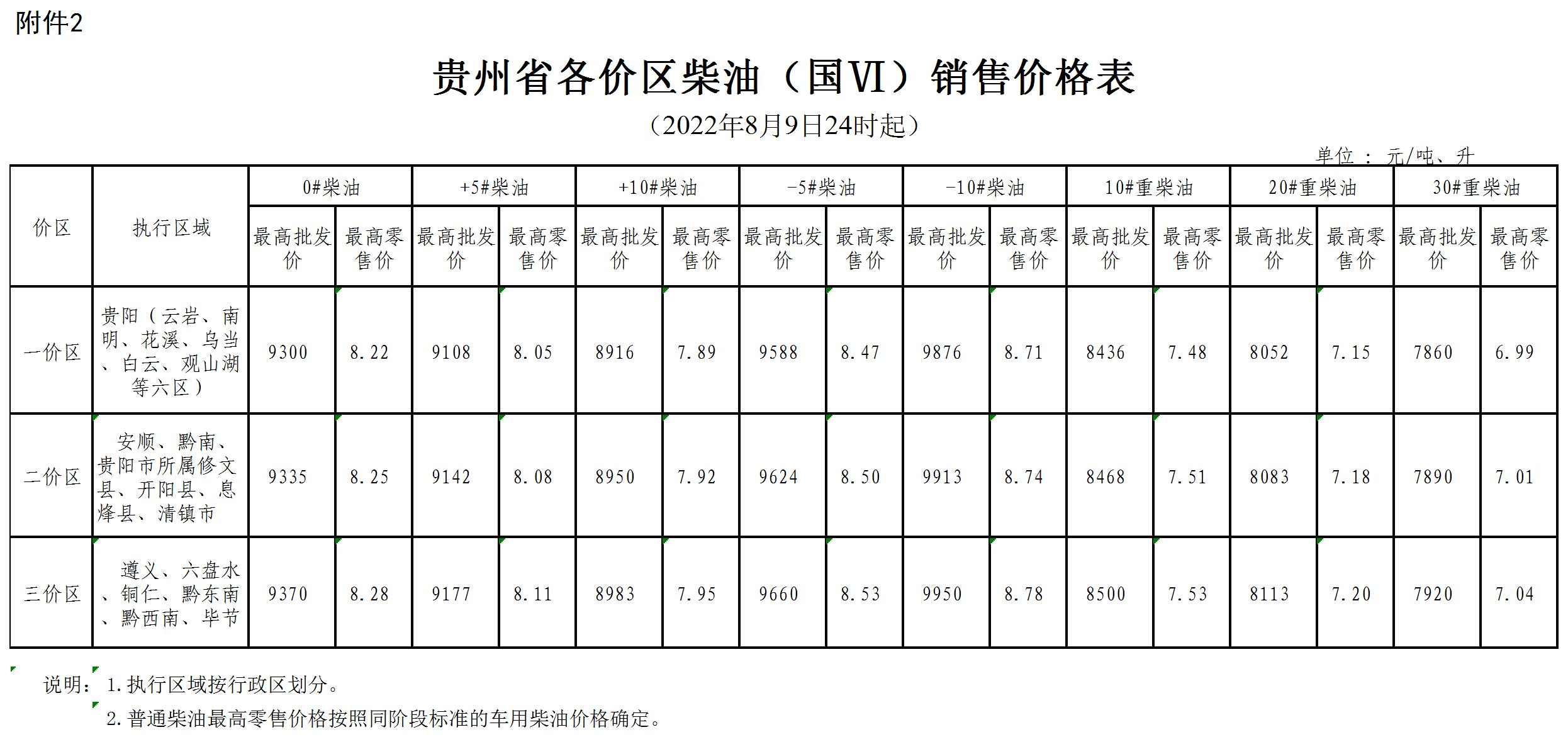 三、贵州省各价区柴油(国VI)销售价格表