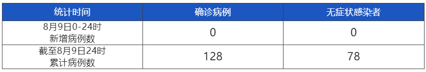 8月9日0-24时,成都“07·20”疫情无新增本土确诊病例,无新增本土无症状感染者。截至8月9日24时,本起疫情累计报告本土确诊病例128例,本土无症状感染者78例。