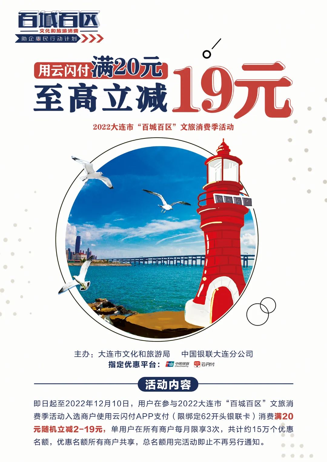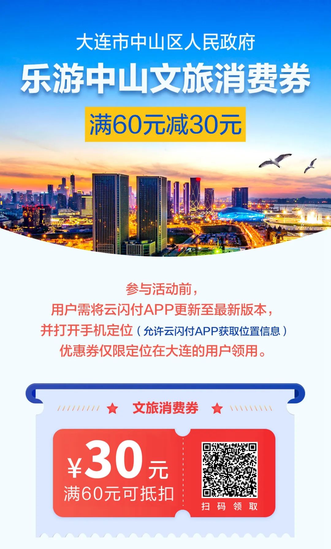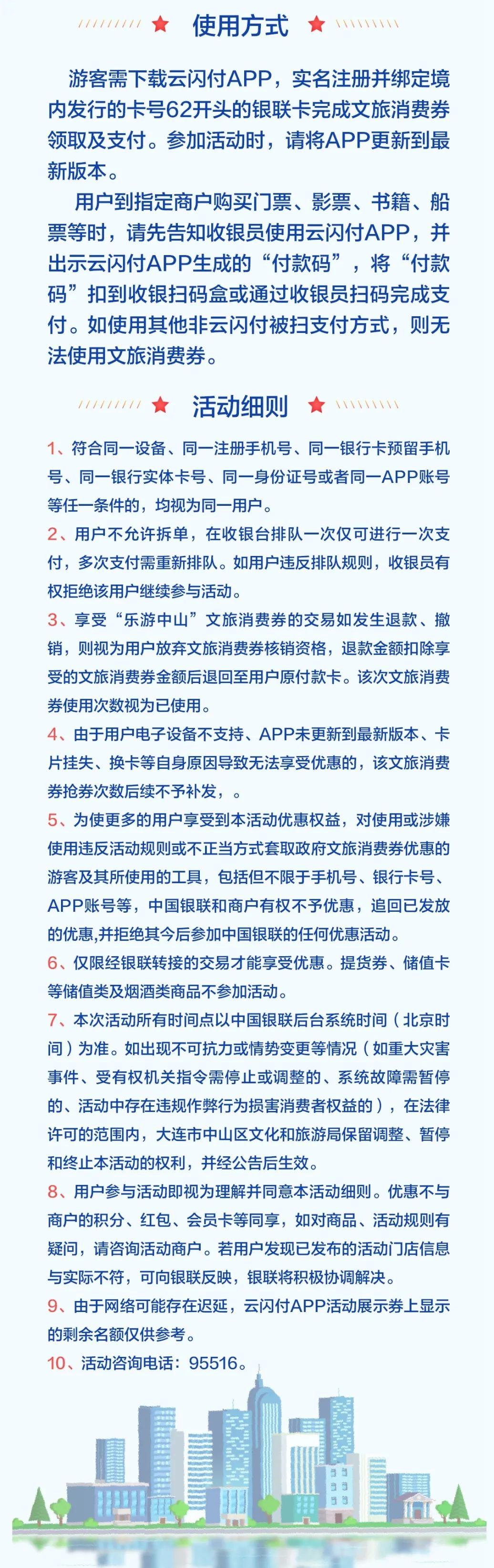 为贯彻落实《中山区落实助企纾困扎实稳住经济一揽子政策措施工作方案》和《关于印发大连市“实施‘百城百区’文化和旅游消费助企惠民行动工作方案”的通知》文件精神,进一步促进中山区文化旅游业发展,提升经济活力,加快助力文旅消费回流,中山区组织开展“乐游中山”100万文旅消费券发放活动。