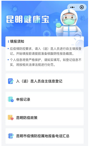 1.所有来(返)昆人员,应至少于抵昆前24小时内通过“昆明健康宝”小程序报备。