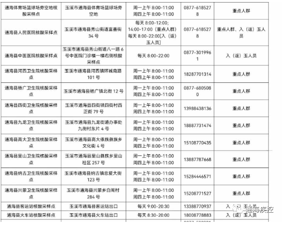 2、玉溪市外入(返)通人员,到达通海后,请第一时间主动到县内核酸检测点完成1次核酸检测。
