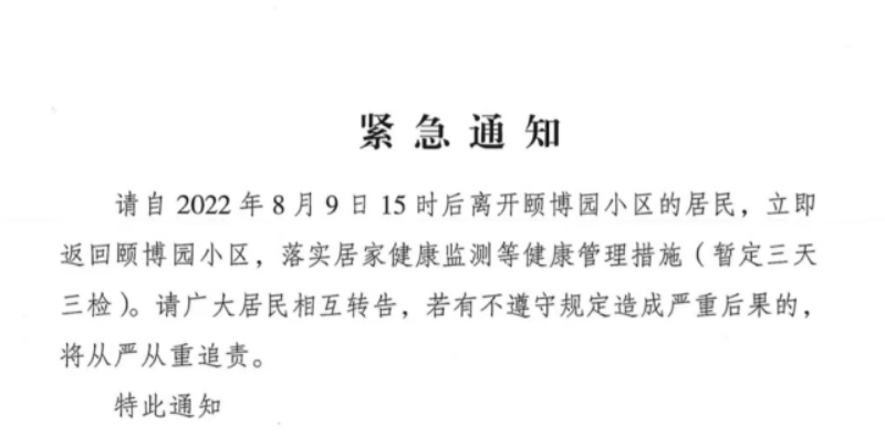 请自2022年8月9日15时后离开颐博园小区的居民,立即返回颐博园小区,落实居家健康监测等健康管理措施(暂定三天三检)。请广大居民相互转告,若有不遵守规定造成严重后果的,将从严从重追责。