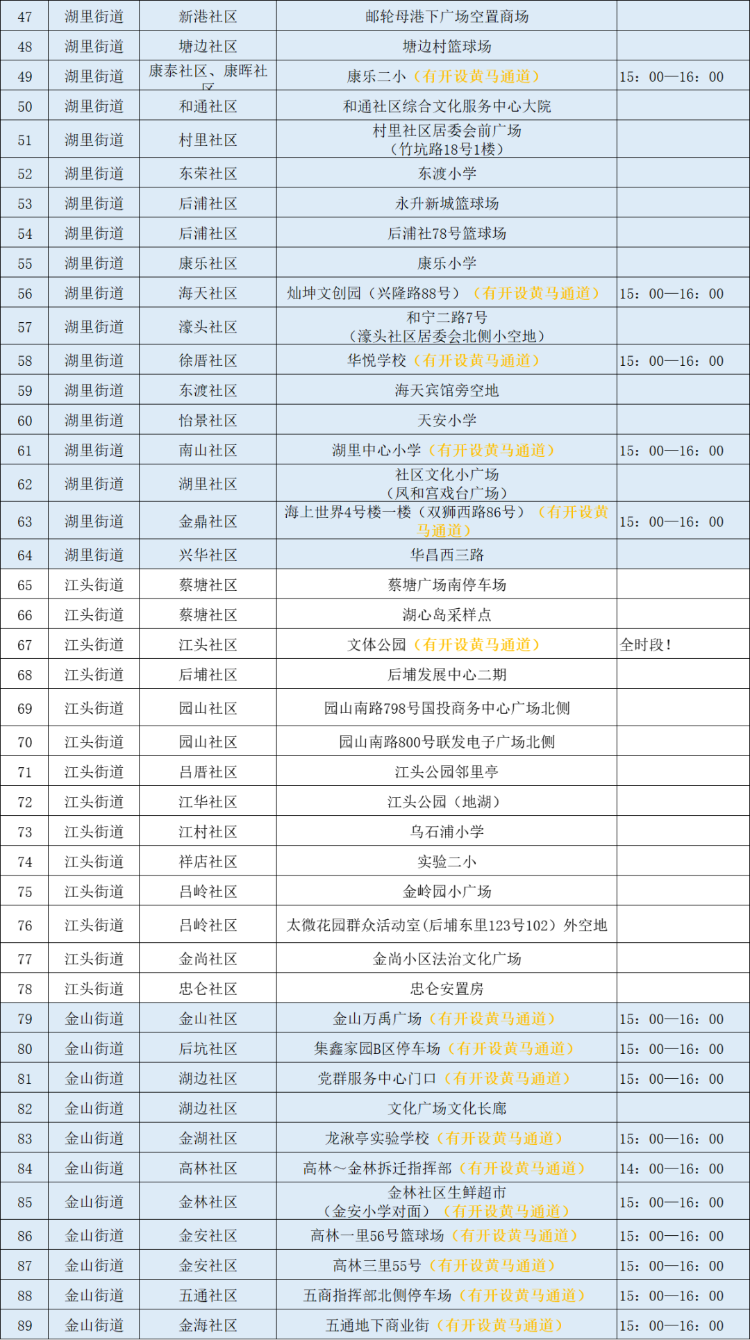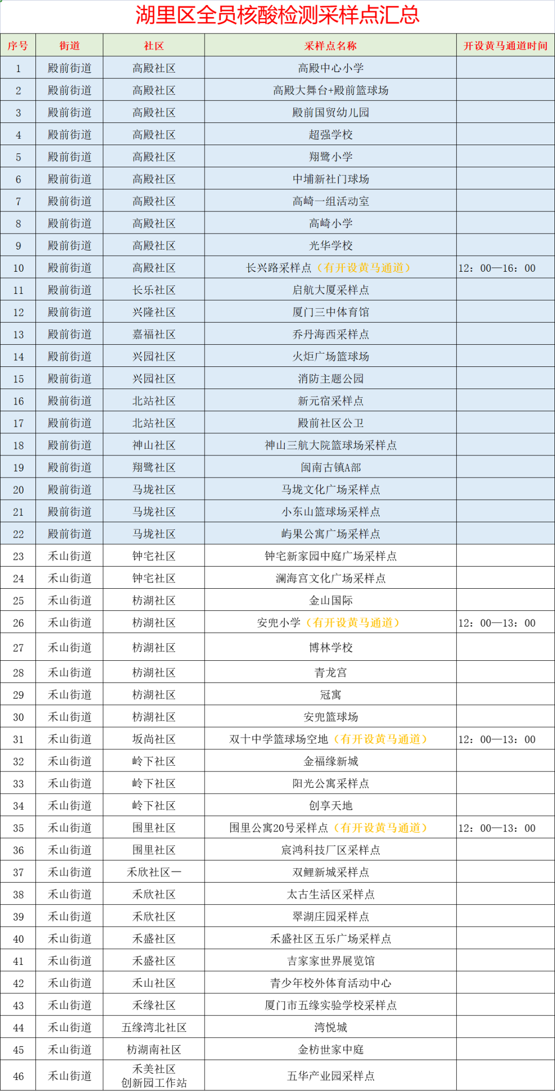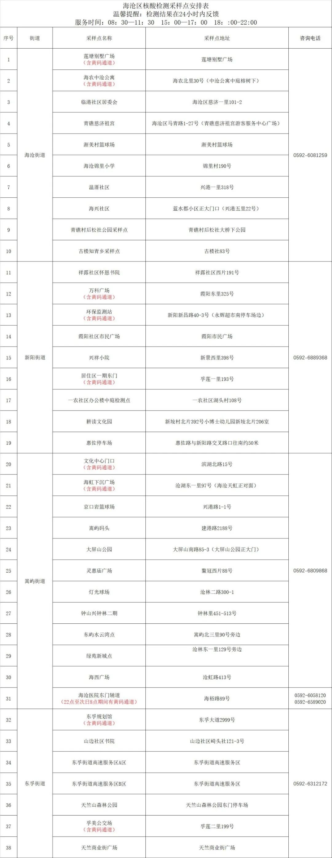 8月11日,海沧区安排38个便民核酸检测采样点,4个街道均设有黄码人员专用检测通道。海沧医院设有24小时核酸检测采样点。