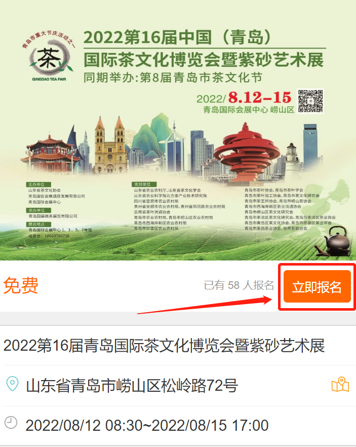 2022青岛国际茶博会门票免费,参观人员需要线上预约方可进入展会。