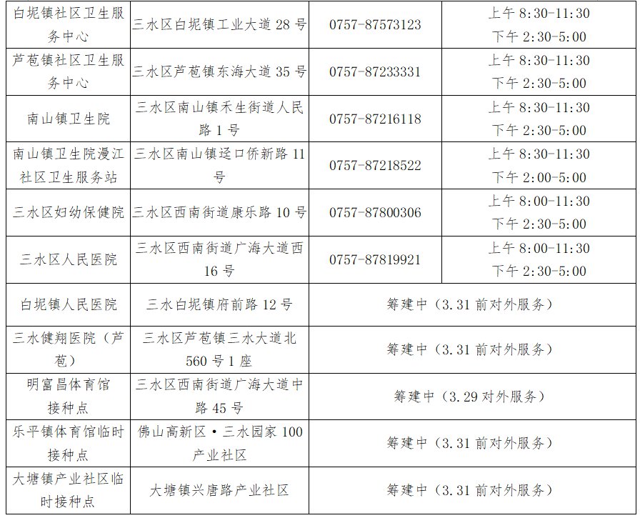 注:三水区专门设立了16个疫苗接种点负责本次大规模人群疫苗接种,其中11个接种点已可对外服务,其他5个将在3月31日前建成对外服务。