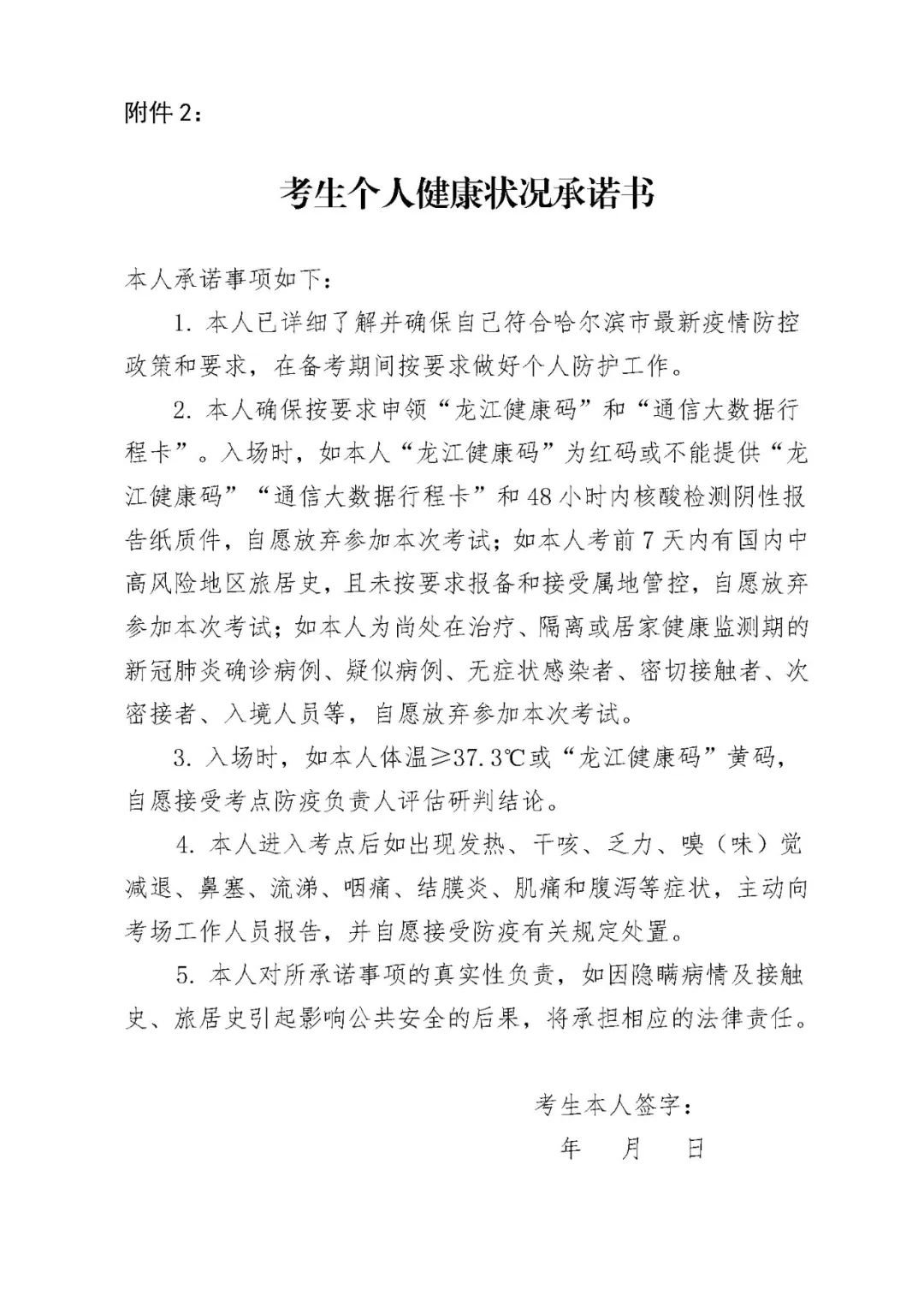 2.考生必须凭准考证、二代居民身份证、考生个人健康安全承诺书、48小时内新冠病毒核酸检测阴性证明纸质版或手机小程序核酸检测阴性证明截图打印件、“龙江健康码”截图打印件和“通信大数据行程卡”截图打印件方可进入考场。