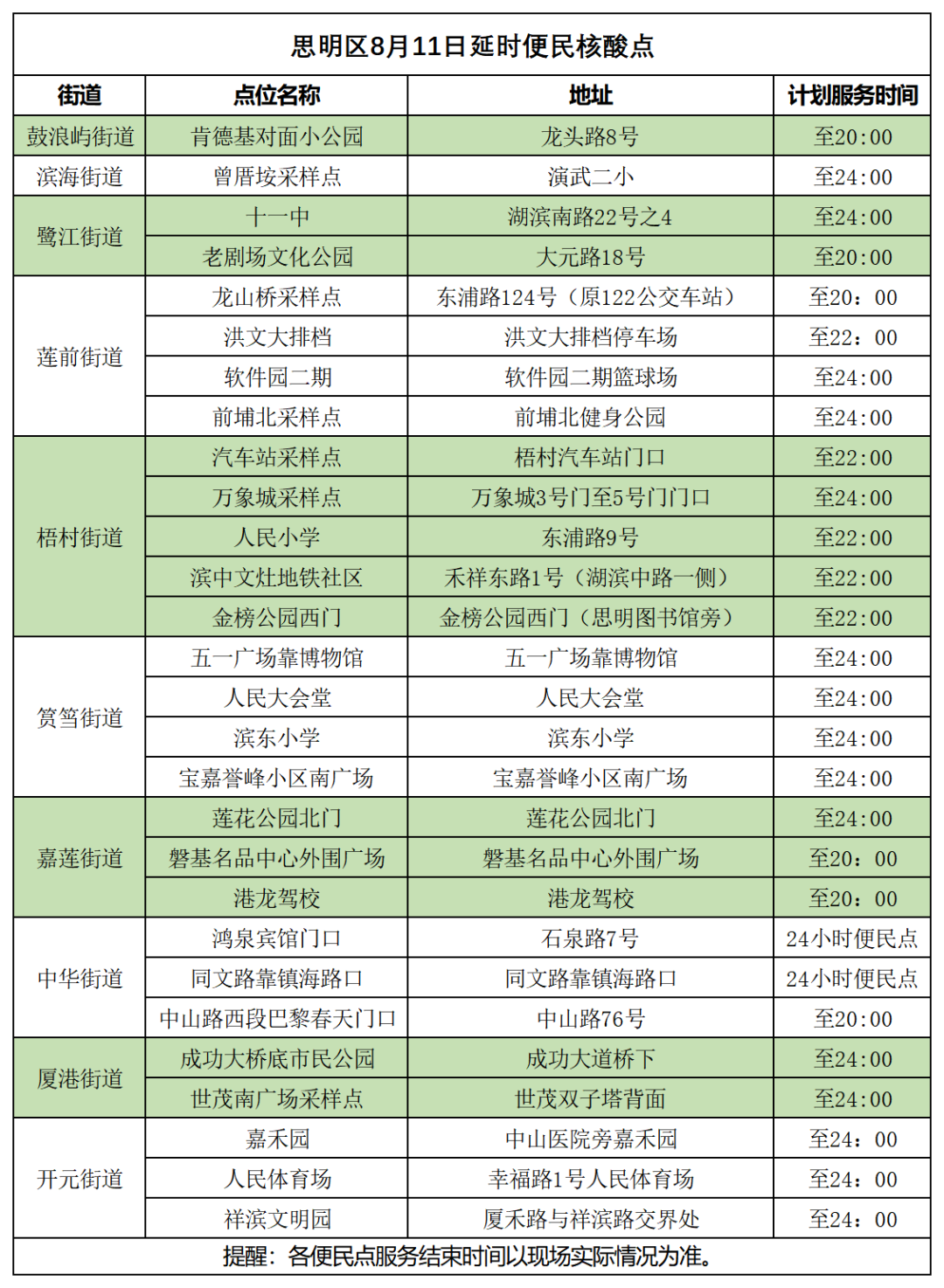 为更方便市民进行核酸检测,根据工作安排,思明区8月11日核酸便民检测点将延长服务时间(具体点位如下),免费为市民群众进行核酸检测。