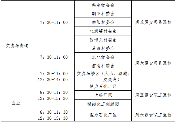 当前,全国疫情形势仍然复杂严峻,旅游热点城市时有规模性疫情发生,大连市新冠肺炎疫情防控总指挥部近日下发通告,要求加强我市常态化核酸筛查机制,由原来每两周做到人群全覆盖,调整为每周做到人群全覆盖,检测时间为每周周五、周六两天,其中周五为长兴岛街道男性居民筛查日,周六为长兴岛街道女性居民筛查日。考虑到交流岛街道人口少且居住分散,周五周六按村采集、男女混检。现将我区调整后的常态化核酸筛查具体时间、地点及筛查对象通知如下: