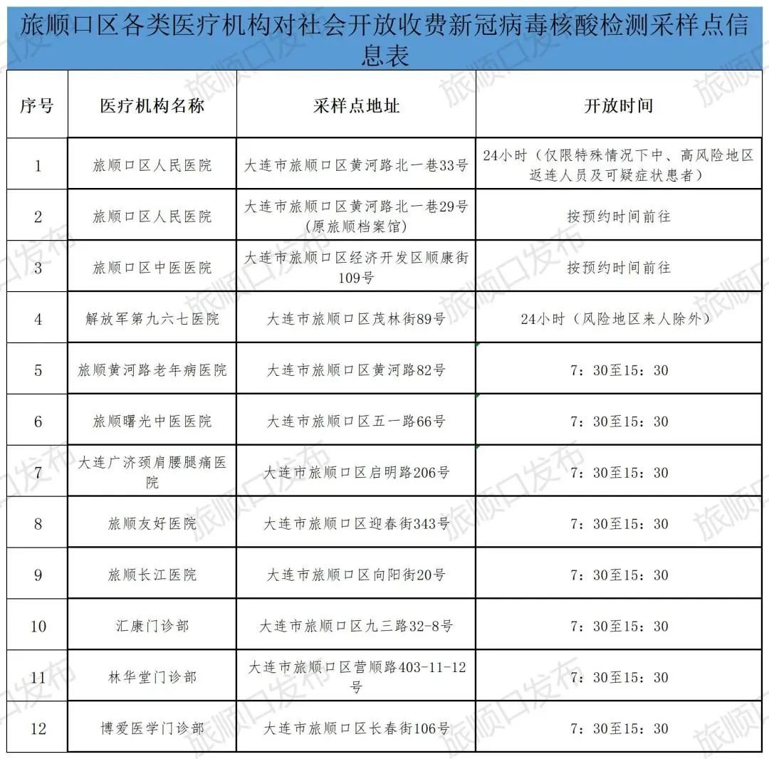三、更新公布全区现有各级各类医疗机构收费核酸采样点信息。收费核酸采样点信息详见“旅顺口区各类医疗机构对社会开放收费新冠病毒核酸检测采样点信息表”,群众可根据需要自由自愿选择收费采样。