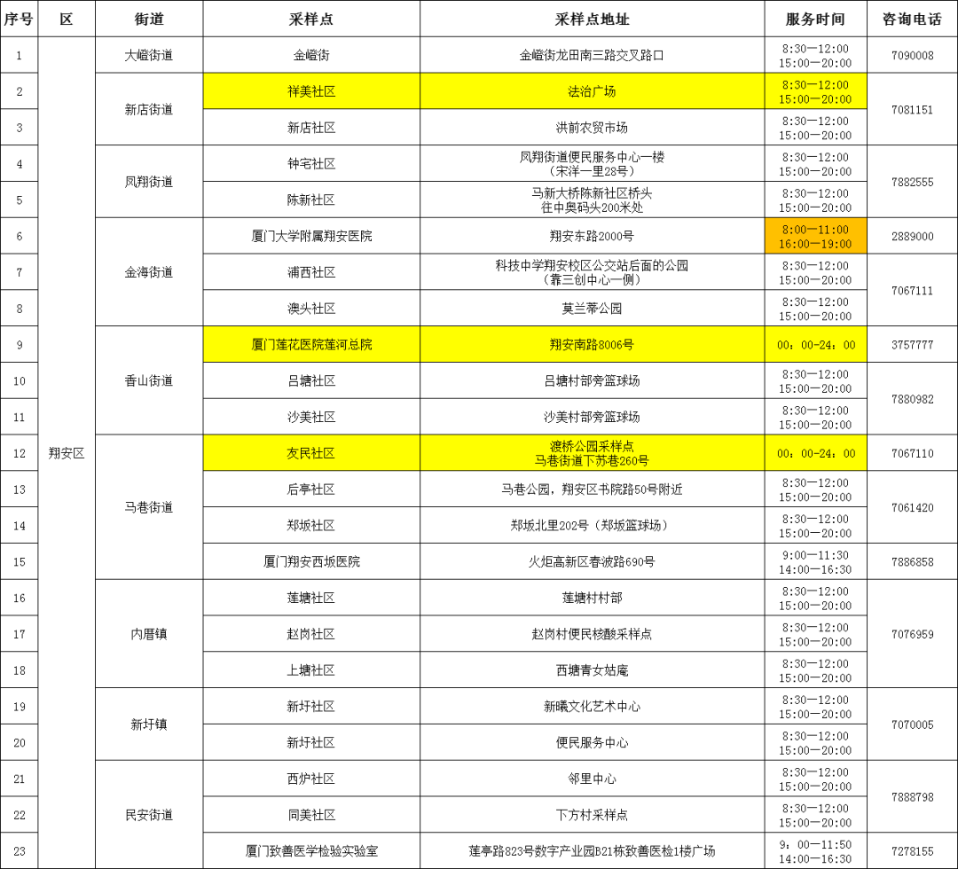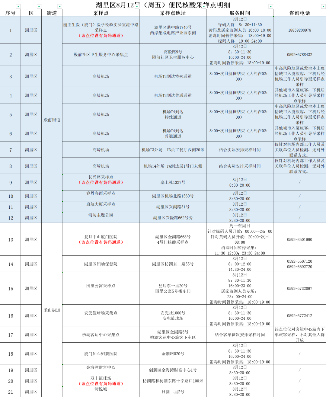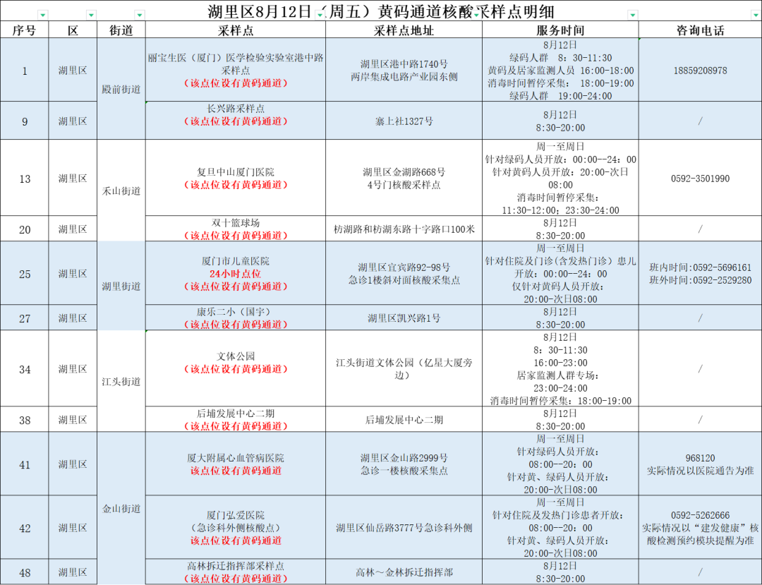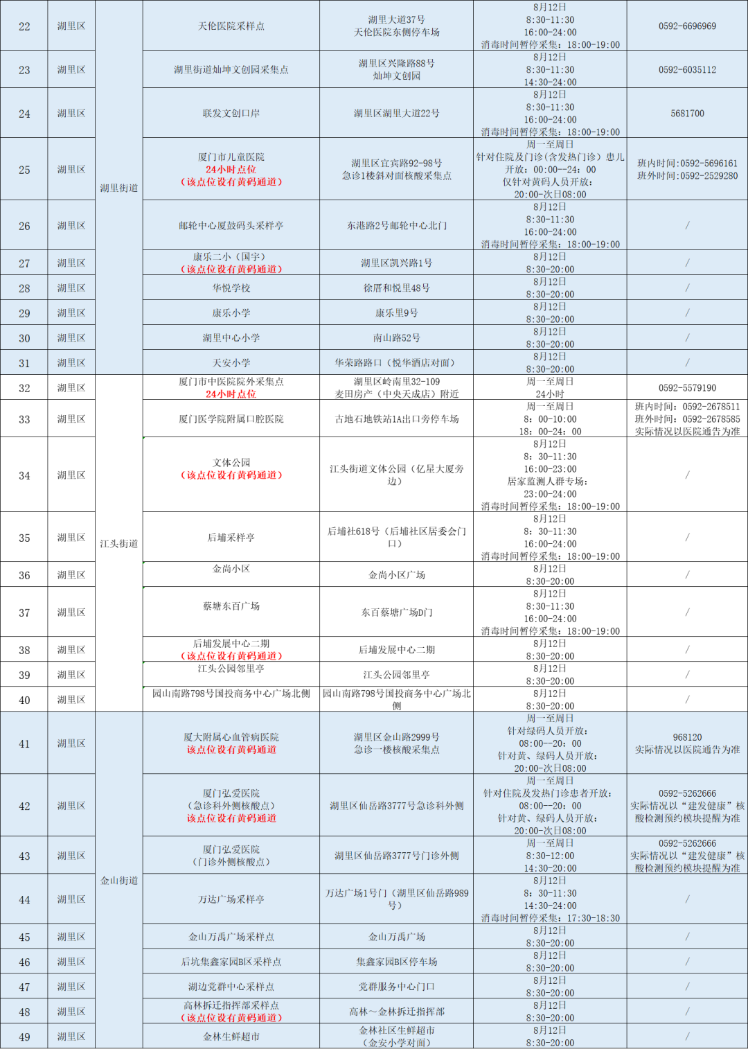 8月12日,湖里区49个全民采样点完整表格(检测结果在24小时内反馈)