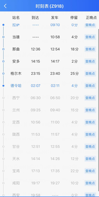 Z918次列车途径站点:拉萨、当雄、那曲、安多、格尔木、德令哈、西宁、兰州、定西、陇西、甘谷、天水、宝鸡、咸阳、西安。