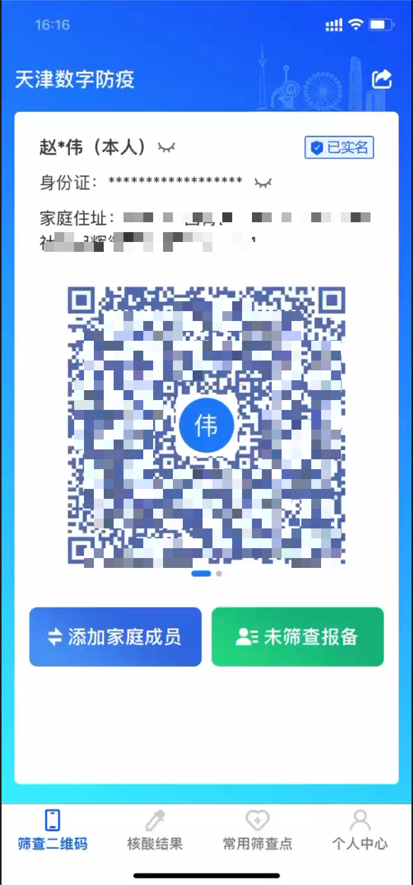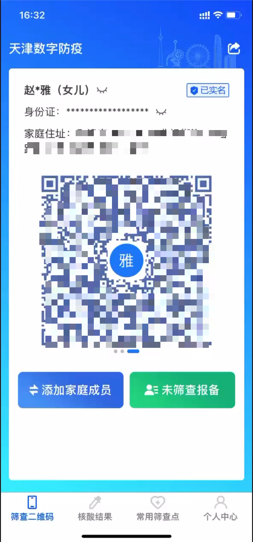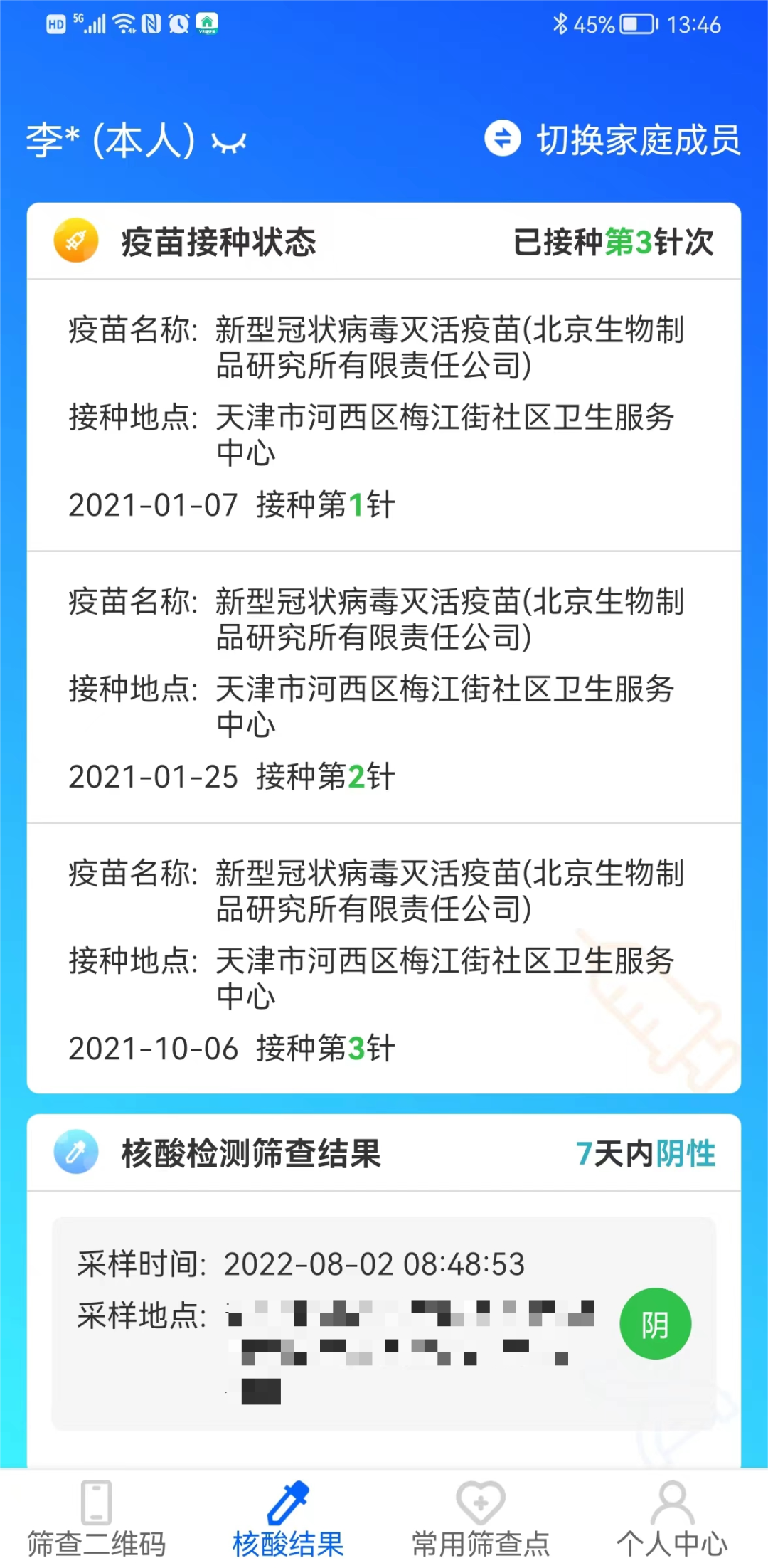 查看最近的核酸检测结果,可切换查看家人的核酸检测结果。