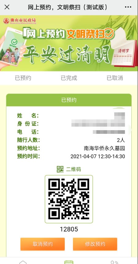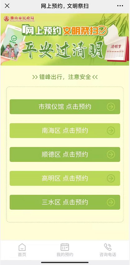2022年清明期间(4月3日~4月17日),佛山所有殡葬服务单位将统一采取预约、错峰、限流等措施,市民在前往祭扫前必须完成实名预约,并在进入殡葬服务单位时出示预约码。