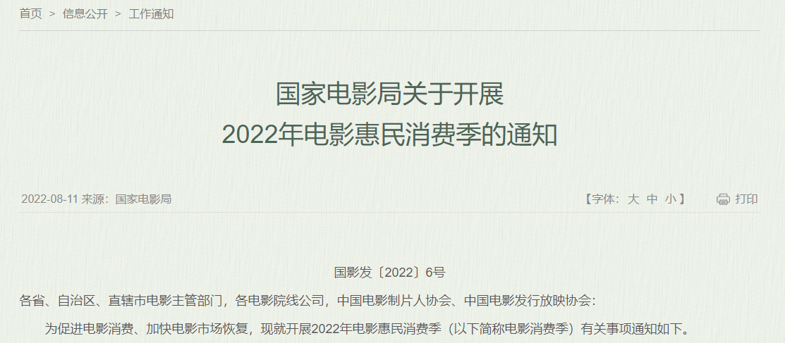 根据国家电影局发布的《国家电影局关于开展2022年电影惠民消费季的通知》: