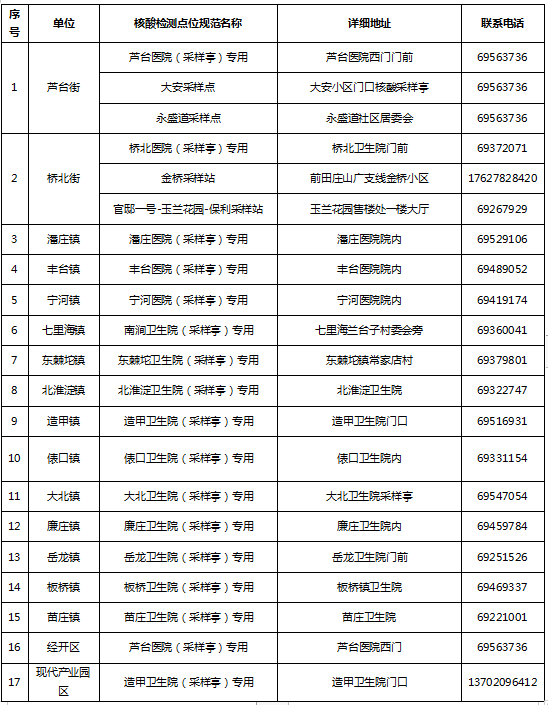 为全面维护人民群众生命安全和身体健康,坚决做到“应检尽检、不落一户、不漏一人”,结合我区实际情况,区疫情防控指挥部决定,全区在完成今天核酸检测的基础上,于8月13日中午后,适当保留部分采样通道,继续开展核酸检测,同时保留流动队伍,进行入户采样。具体采样通道和联系方式如下: